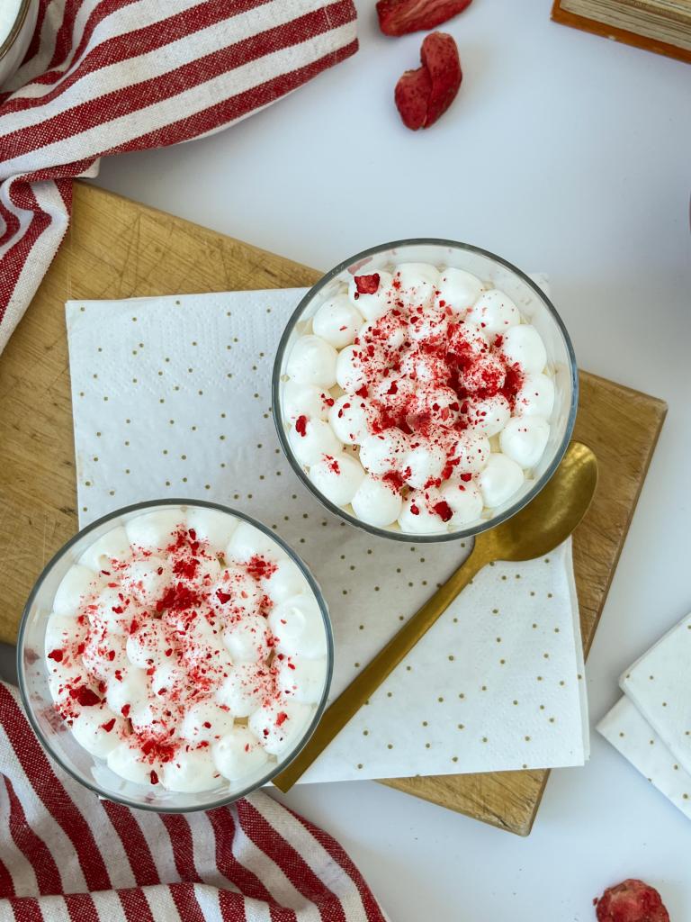 Zasebno razradite vrhnje za šlag i krem sir sa zaslađivačem. Kada se sir sjedinio sa zaslađivačem dodajte istučeno vrhnje za šlag i aromu vanilije. Na laganom programu sve skupa izmiješajte mikserom. Kremu stavite na hlađenje sat vremena te nakon hlađenja prebacite u slastičarsku vrećicu radi lakšeg slaganja u čašu.