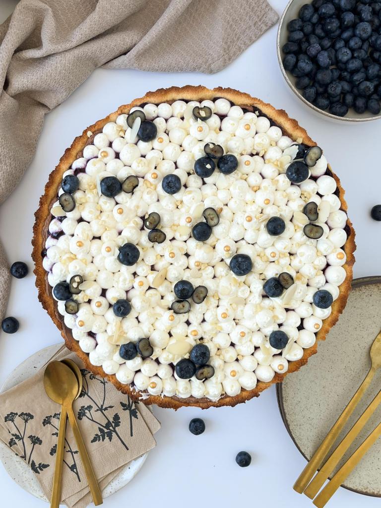 4.For a white chocolate cream first melt the chocolate. While the chocolate is cooling, mix the mascarpone cheese and sweetener with a mixer. Add melted chocolate to the mixture and mix. Prepare the whipped cream with a mixer and add it together with vanilla to the mixture with chocolate and mascarpone cheese. Spread the cream over the blueberry dressing.