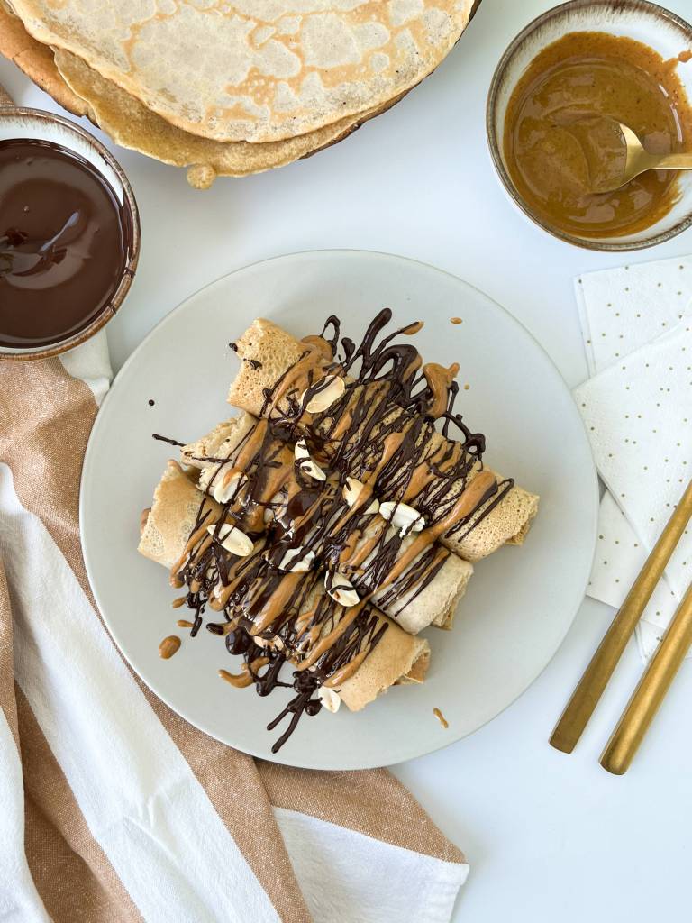 This time I used peanut butter and melted dark chocolate for the filling, and you can do whatever suits you best with the crepes.