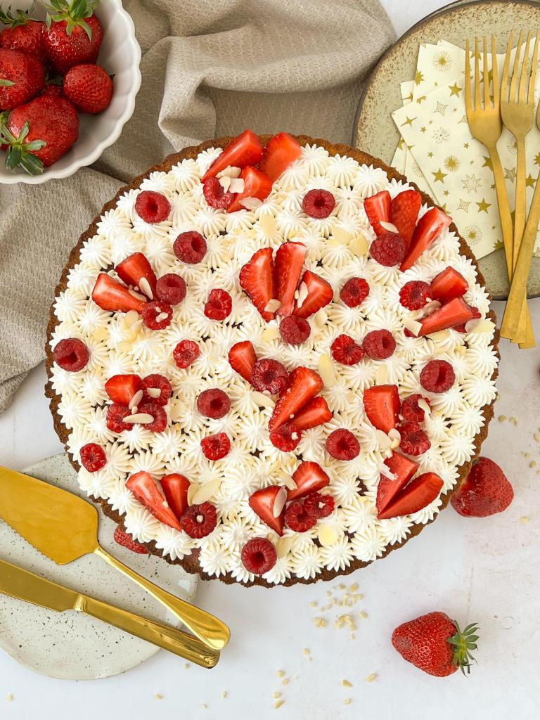1.Mix the eggs together with the sweetener until the mixture doubles in size and becomes lighter. Then add all ingredients except flour to the resulting mixture. Mix until the butter is completely combined with the rest of the mixture. Then gradually add flour and continue mixing. Leave it to cool for 30 min. The dough will be quite soft, but it should not stick to your hands. Put the ball of dough in the mold and stretch it with your hands (it is very difficult to roll it with a rolling pin, I do not recommend it). Make sure that your edges remain a little thicker. Before baking, prick the entire surface of the dough with a fork. Bake for about 20 minutes at 180˚ C. At the beginning, you can cover the dough with baking paper to prevent the edges from burning. At the end of baking, the dough should be golden. The ingredients are adapted for a mold with a diameter of 26 cm.