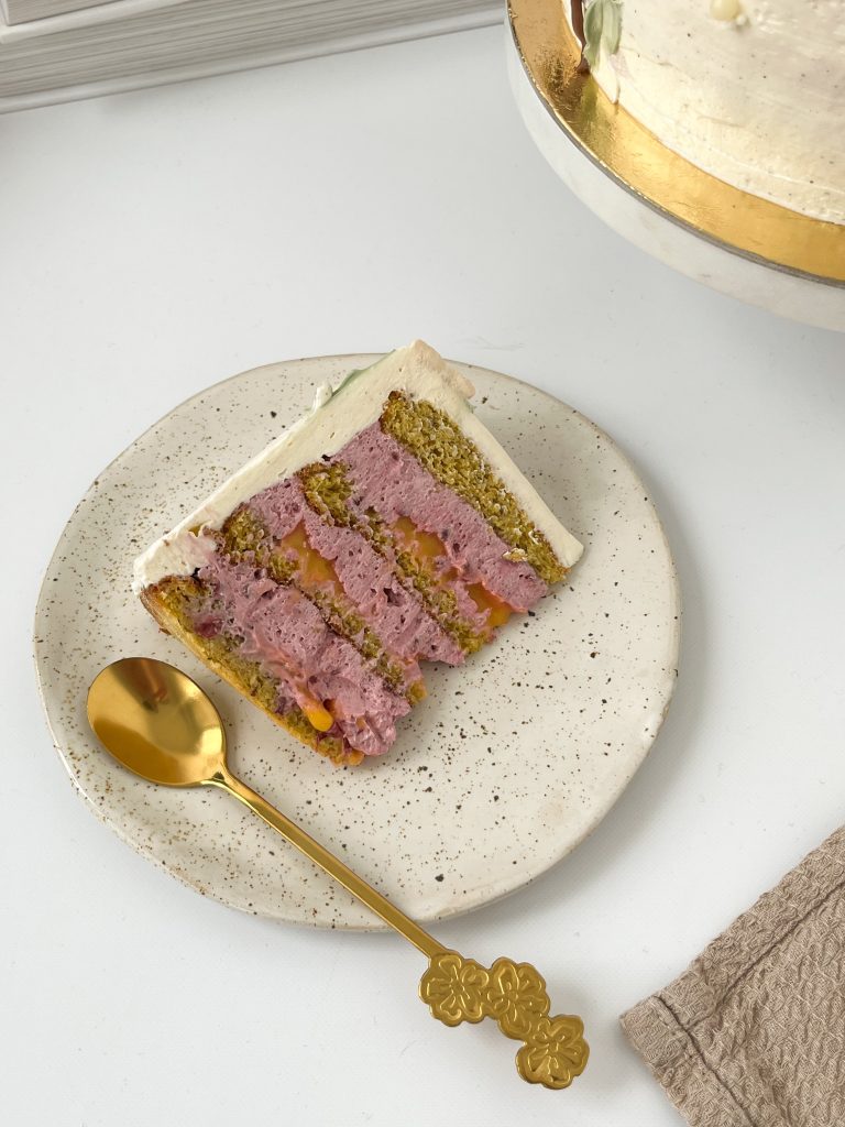 Za početka odvojite žumanjke od bjelanjaka. Žumanjke zajedno sa zaslađivačem razradite mikserom dok smjesa ne postane svjetlija i pjenastija. U dobivenu smjesu dodajte maslinovo ulje i vaniliju te sve skupa pomiješajte. Zatim dodajte suhe sastojke (bademovo brašno, pistacije i prašak za pecivo) te miješajte mikserom ili pjenjačom dok se sve skupa ne poveže. Za kraj lagano ćete umiješat i snijeg od bjelanjaka koji ste prethodno napravili. Sastojci su prilagođeni za dva kalupa promjera 18 cm. Smjesu prepolovite na pola i stavite peči u odvojenim kalupima. Na taj način ravnomjerno će vam se ispeći biskviti bez straha da zagore ili ostanu sirovi u sredini. Peći na 160˚C 15-20 min ovisno o jačini grijača u pećnici. Kako bi ste bili sigurni da je biskvit pečen, provjerite čačkalicom sredinu.